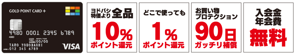 ヨドバシカメラのお買い物で11%ポイント還元。世界3,000万店のVisaが使えるお店でも1%ポイントが貯まります。さらに、ヨドバシカメラでお買い物された商品*1はお買い物プロテクション(90日間)でガッチリ補償。その他にも会員様限定特別価格セールの開催などヨドバシカメラユーザー必携のカードです。もちろん入会金・年会費は無料。
