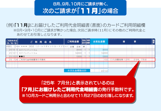 なお、発行手数料以外にご請求がない場合は、次回のご利用代金請求月まで繰り延べされます。